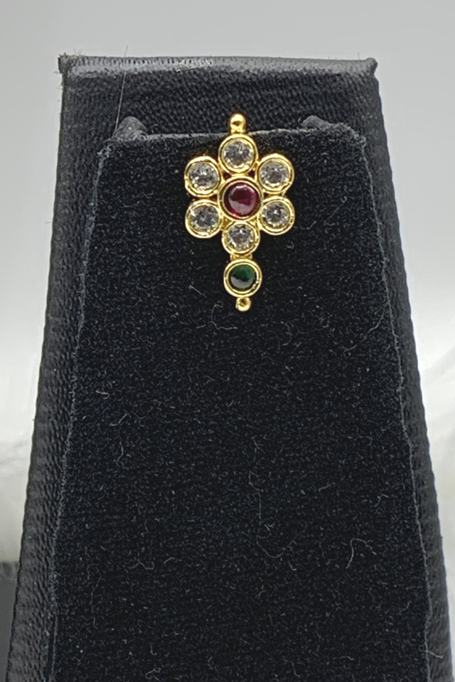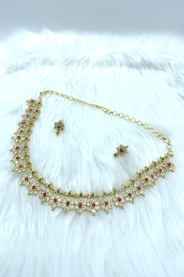 Gold Pleated Flower kundan set with White kundans Pink and green stones suits on all outfits paired with White Kundan Flower Earrings with pink stone.